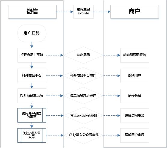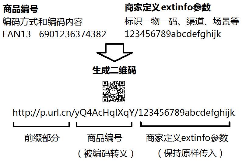 微信提供的二维码内容由“固定前缀”、“转译压缩后的商品id”、“自定义参数”三部分组成。其中,固定前缀占用16个字符,用于微信客户端识别;商品id占用12个字符,用于唯一标识一款商品;自定义参数由商户传入,将作为主键在【生成二维码->用户扫描->打开商品主页->访问商户设置的网页】这整个流程中作透传,商户可以通过接收微信推送的事件和检查ticket来定位一个二维码和一个用户的对应关系。