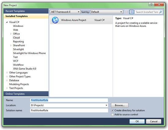 以管理员权限启动 Visual Studio 2010 ,并且新建一个 Windows Azure Project 项目。