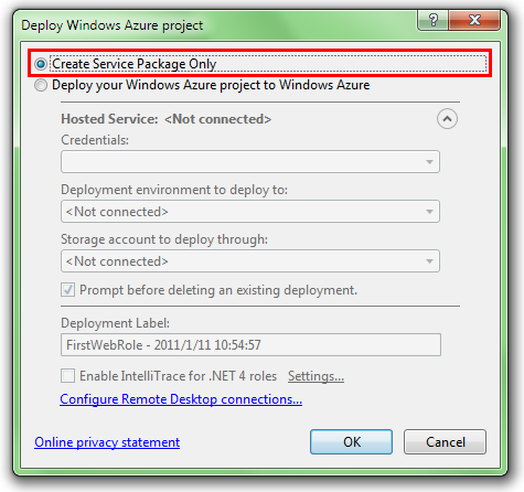 在弹出来的 Windows Azure 项目部署窗口里,选择 Create Service Package Only 选项: