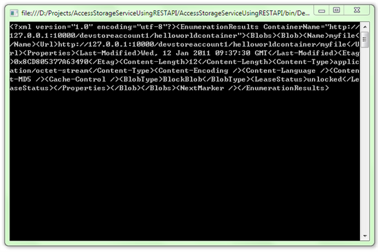 该 API的作用是返回给定的 Container中的 Blob信息。为了测试我们的代码我们首先需要有一个已经创建的 Container并且向其中添加至少一个 Blob。由于如何添加 Container和 Blob的方法我们已经在 Windows Azure入门教学系列 (四 ):使用 Blob Storage 中提过,在此不赘述。读者可以按照 Windows Azure入门教学系列 (四 ):使用 Blob Storage 中的代码创建名为 helloworldcontainer的 Container和名为 myfile的 Blob。 (只需注释掉删除 Blob的代码并运行程序即可 )